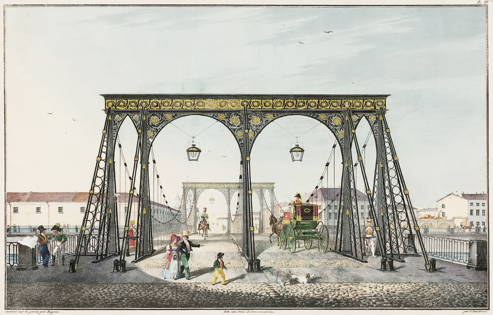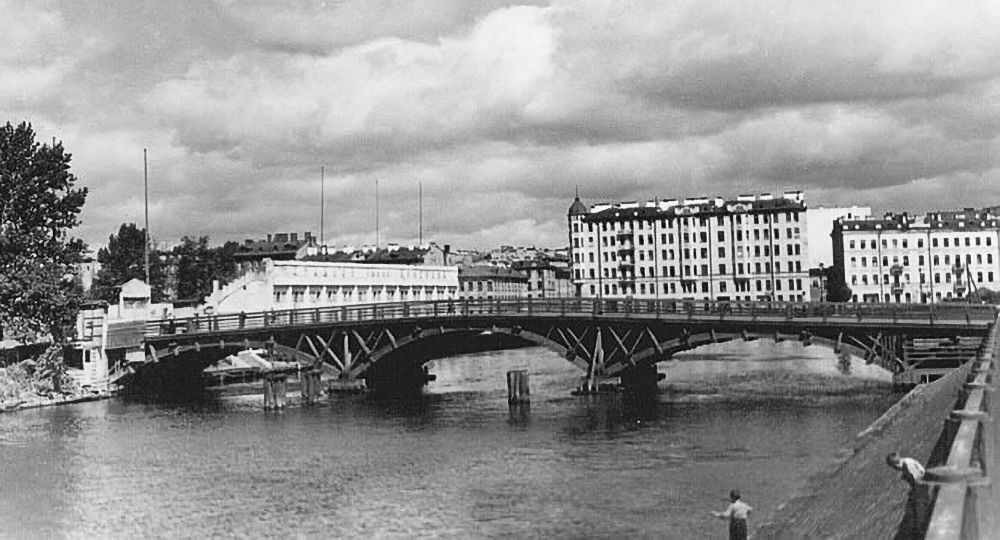 Пантелеймоновский мост через Фонтанку построили в 1824 году по проекту инженера Вильгельма фон Треттера. Это был первый цепной мост через Фонтанку, предназначенный для проезда экипажей. За богатый декор мост называли «эоловой арфой» и «струнным органом». Однако у него был и недостаток — качка, когда по нему проходило много людей. В 1862 году мост отремонтировали: заменили балки, поставили железную решетку вместо чугунных перил. В 1905 году городские власти решили разобрать мост и проложить трамвайные пути. В 1908-м на его месте построили новый Пантелеймоновский однопролетный арочный мост, который сохранился до наших дней.