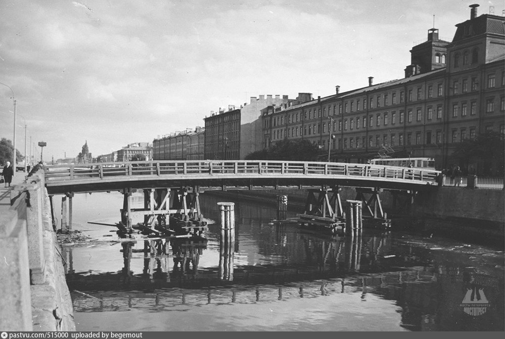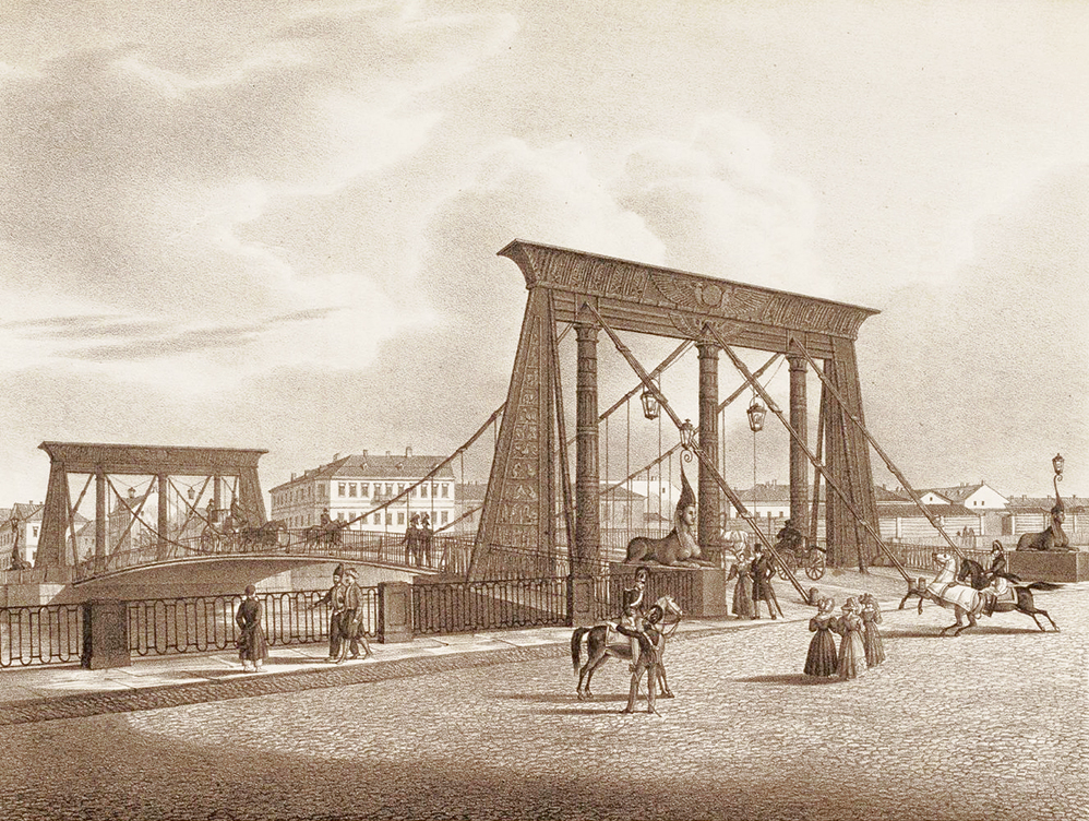Цепной однопролетный мост через Фонтанку построили в 1826 году по проекту инженеров Вильгельма фон Треттера и Василия Христиановича. Он простоял 80 лет — в 1905 году рухнул в Фонтанку, когда по нему проходил конно-гренадерский полк. Погибли три лошади. Из-за чего именно обрушился мост, до сих пор точно не известно. Предполагается, что из-за ошибок проектировщиков и строителей. Но есть городская легенда, согласно которой Мария Ратнер, жившая рядом, крикнула в окно: «Чтоб вам провалиться!» — и мост рухнул. Горожанку стали называть Марией Египетской.