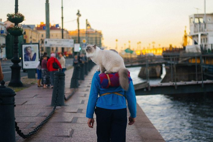Житель Васильевского острова гуляет по набережным со своим котом Пончиком. Что здесь необычного? Мужчина почти всегда носит питомца на спине и по этой причине стал местной знаменитостью. «Бумага» рассказывает историю этой пары.