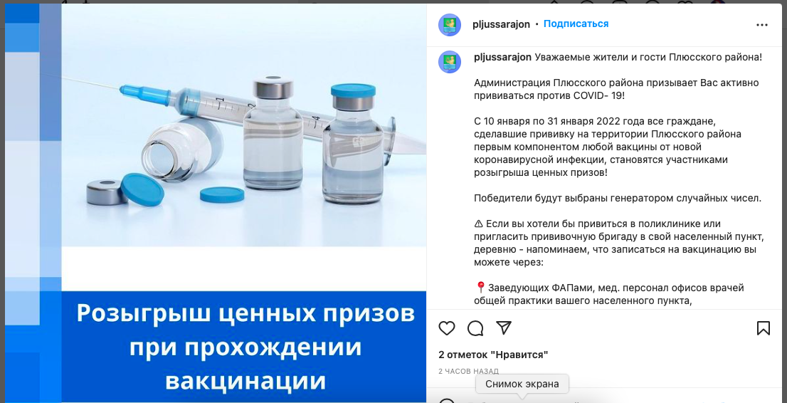 Администрация Плюсского района проводит розыгрыш ценных призов среди вакцинированных от COVID-19: об этом районные власти сообщили на своей странице в Instagram.
