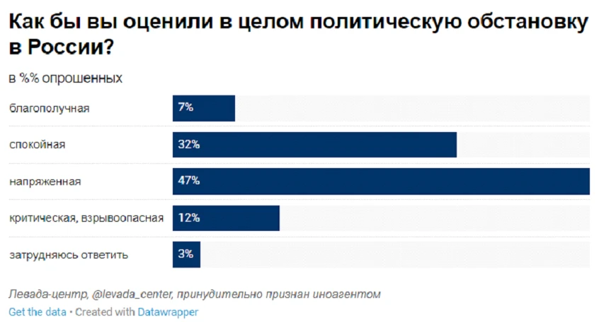 Почти половина россиян (47%) оценивают политическую обстановку в России как напряженную, 12% — как критическую, следует из опроса «Левада-центра»* (есть в распоряжении «Новой газеты»).