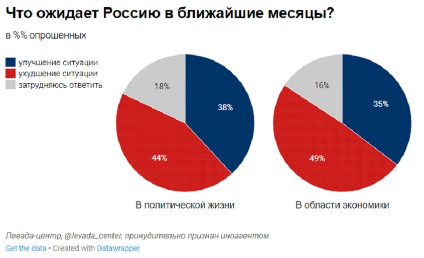 При этом около половины опрошенных считает, что Россию в ближайшие месяцы ждет ухудшение ситуации как политической, так и экономической ситуации (44% и 49%).