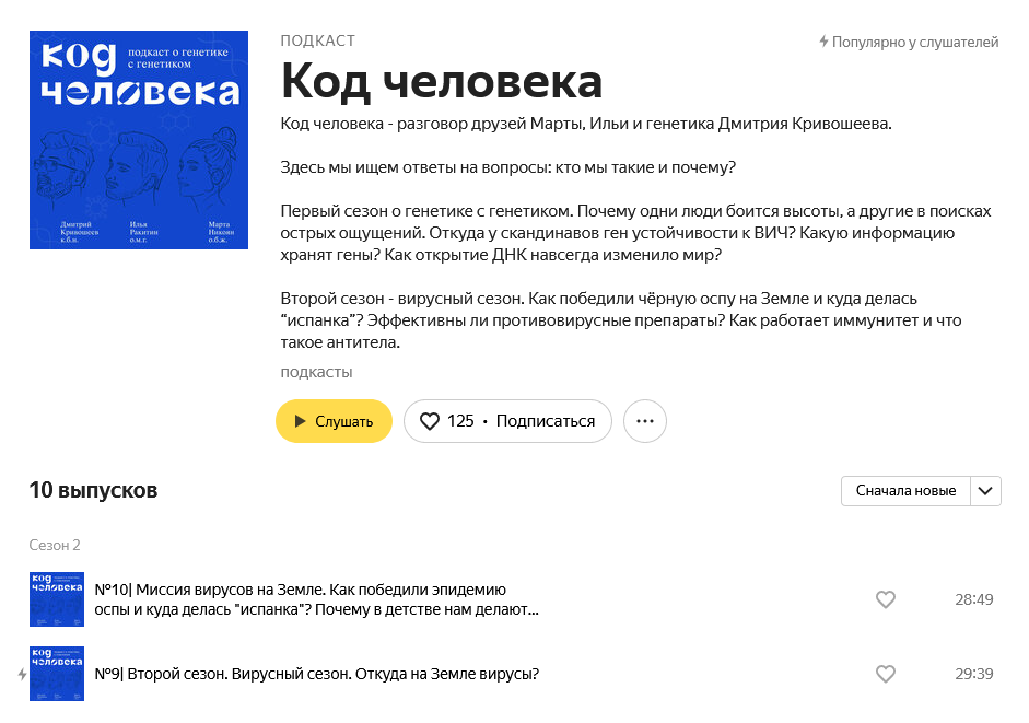 Подкаст "Код человека" выходит с августа этого года – друзья предложили Дмитрию Кривошееву ответить на ряд вопросов по генетике. В первом сезоне получилось восемь выпусков, где микробиолог рассказывает о генетических заболеваниях, разбирает мифы о генах и ДНК-тестах. Второй сезон – про вирусы. По итогам года "дружеский разговор" попал в топ лучших подкастов на Apple podcasts в категории "Естественные науки" – сейчас он на 11-м месте в разделе.