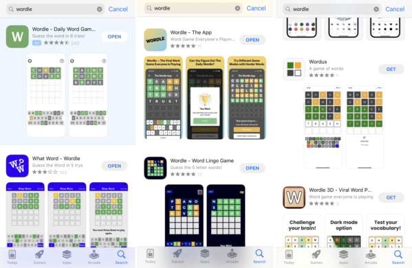 Вместо Уордла приложения с игрой сделали другие разработчики: они почти полностью повторяли интерфейс оригинала и даже название, однако ссылок на оригинальный сайт или его автора в большинстве не было указано. Журналисты The Verge опробовали пять разных версий игры из App Store, и только в одной из них нашли упоминание автора — она же оказалась единственной, не повторявшей название игры.