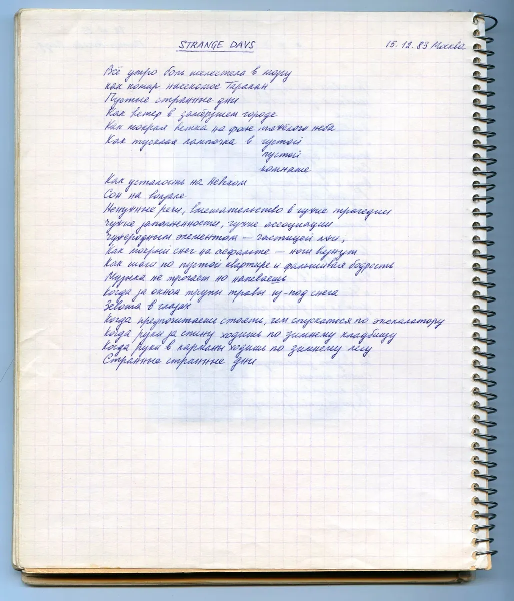 Она также опубликовала лист из тетради Летова со стихотворением Strange Days 1983 года.