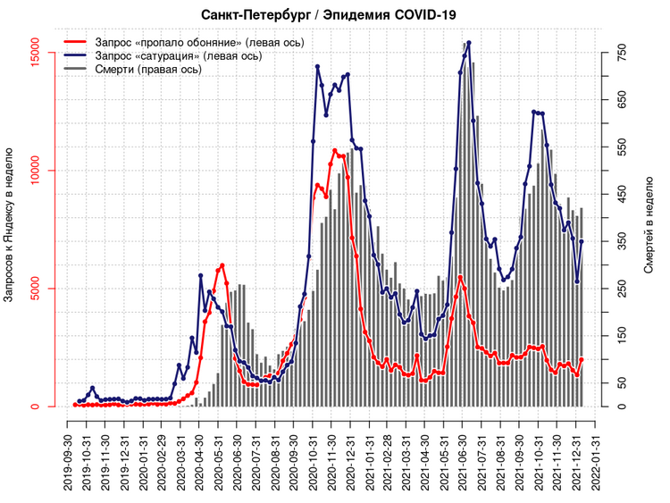 Помимо этого, в Петербурге растет количество проводимых тестов в день, а также число запросов в «Яндексе» с ключевыми словами «пропало обоняние» и «сатурация», следует из графиков Куприянова.