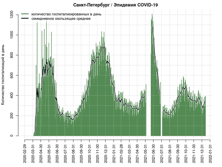 С 7 по 13 января в Петербурге госпитализировали 2383 человека с коронавирусом — это на 21,33 % больше, чем неделей ранее. Об этом свидетельствуют основанные на официальных данных подсчеты исследователя коронавирусной статистики Алексея Куприянова.