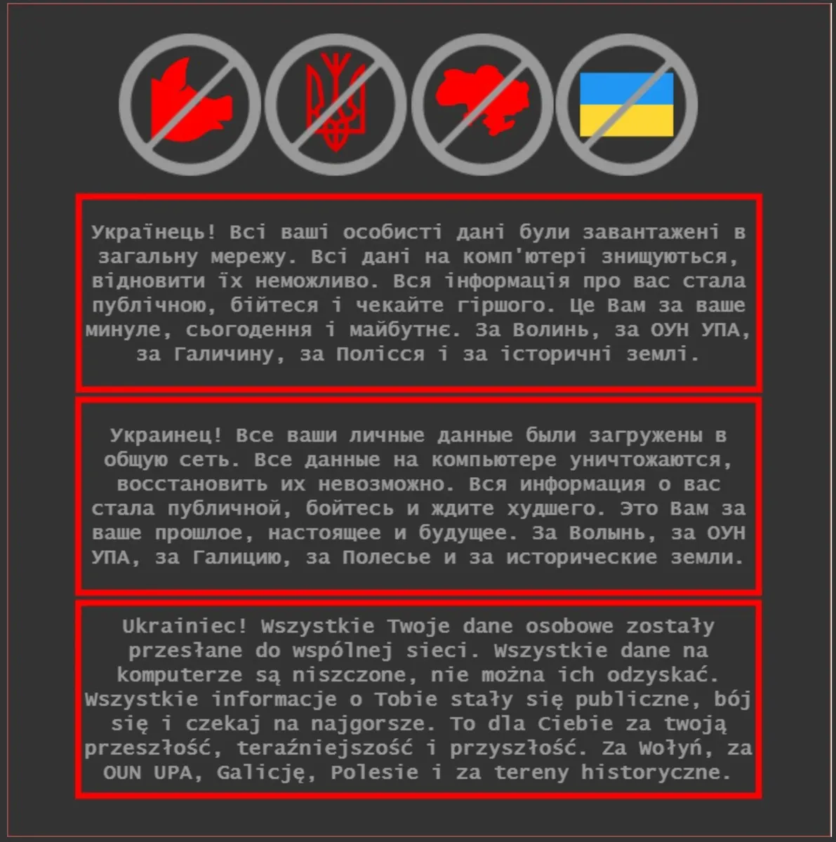 При попытке перейти на сайт Минагрополитики Украины на экране появляется сообщение на трех языках — украинском, польском и русском — в котором говорится, что все личные данные украинцев загружены в «общую сеть». Текст также призывает читателей «бояться и ждать худшего».