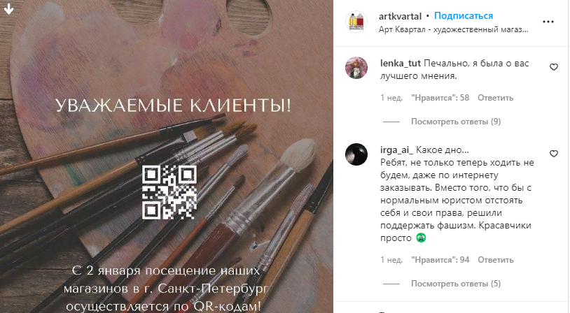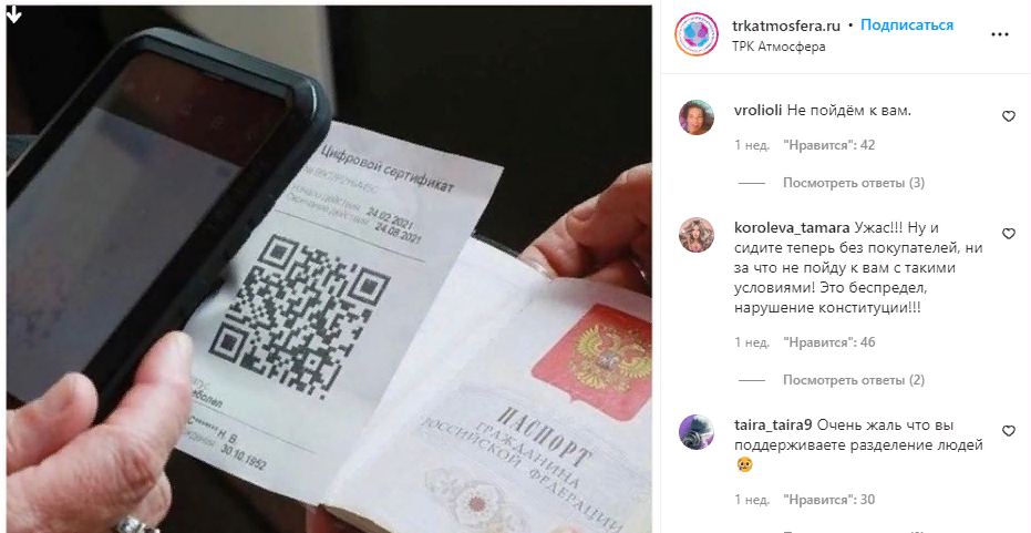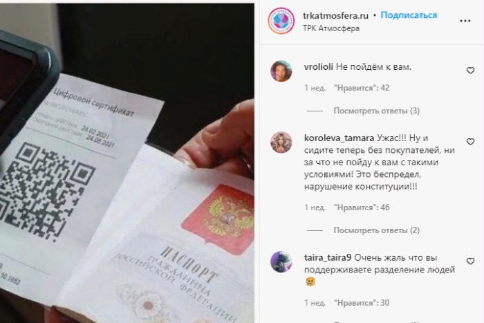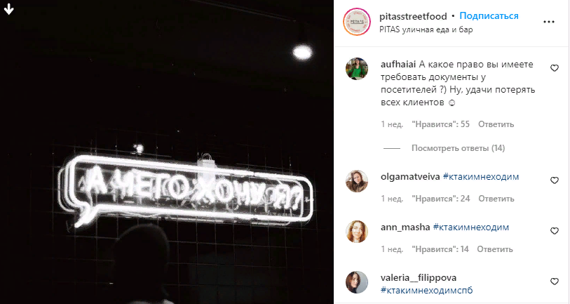 После публикаций на страницах заведений стали появляться негативные комментарии. Десятки сообщений с критикой из-за проверки QR-кодов, например, получила сеть Pita’s (часть пользователей критикует сеть за проверку документов вместе с QR-кодом). С такой же ситуацией столкнулись сеть художественных магазинов «Арт-квартал», ТРК «Атмосфера», сеть благотворительных магазинов «Спасибо!».