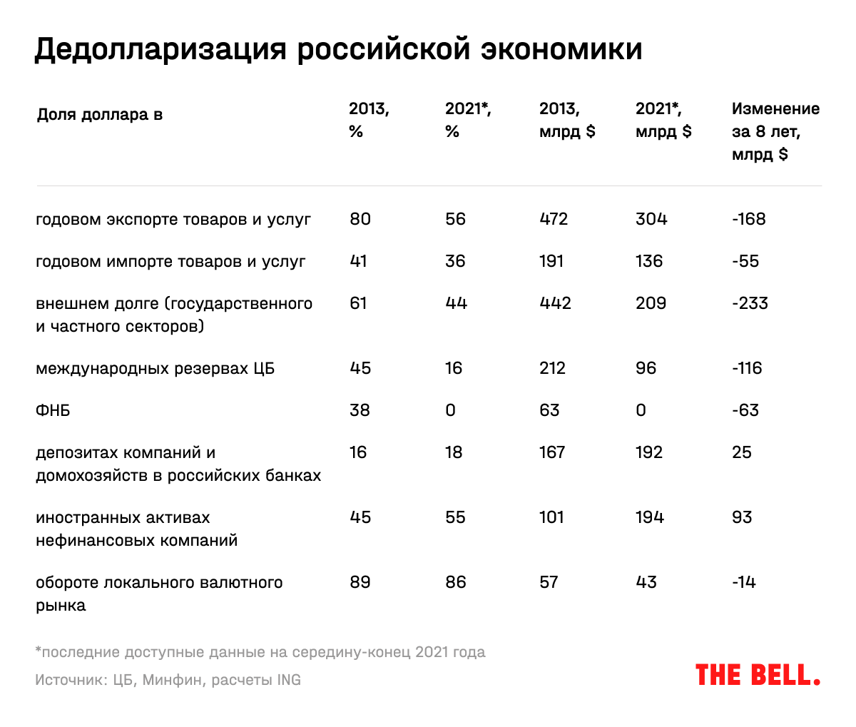 Дедолларизация. Еще более серьезная угроза — возможная блокировка американских корсчетов российских банков, которая фактически лишит их возможности проводить долларовые операции. Опасение такого сценария заставило российское правительство в 2014 году приступить к дедолларизации экономики — и добиться в ней определенных успехов: по сравнению с «досанкционным» 2013 годом Россия действительно смогла существенно снизить зависимость от доллара в торговых потоках, внешних обязательствах и иностранных активах госсектора, отмечает главный экономист ING по России и СНГ Дмитрий Долгин.