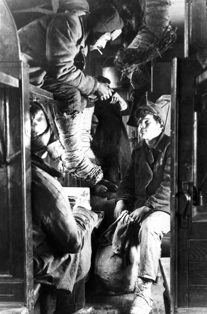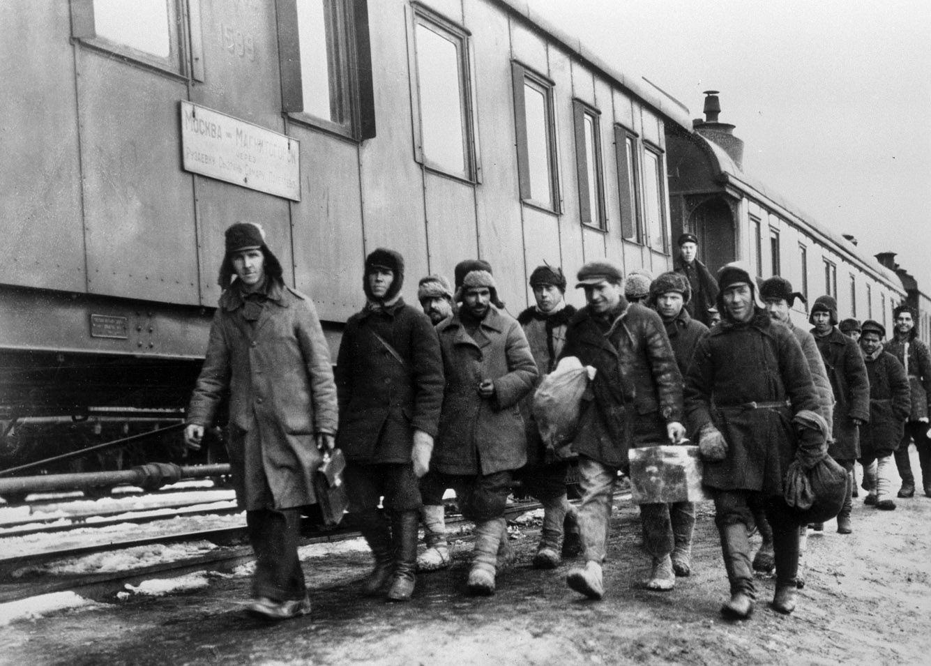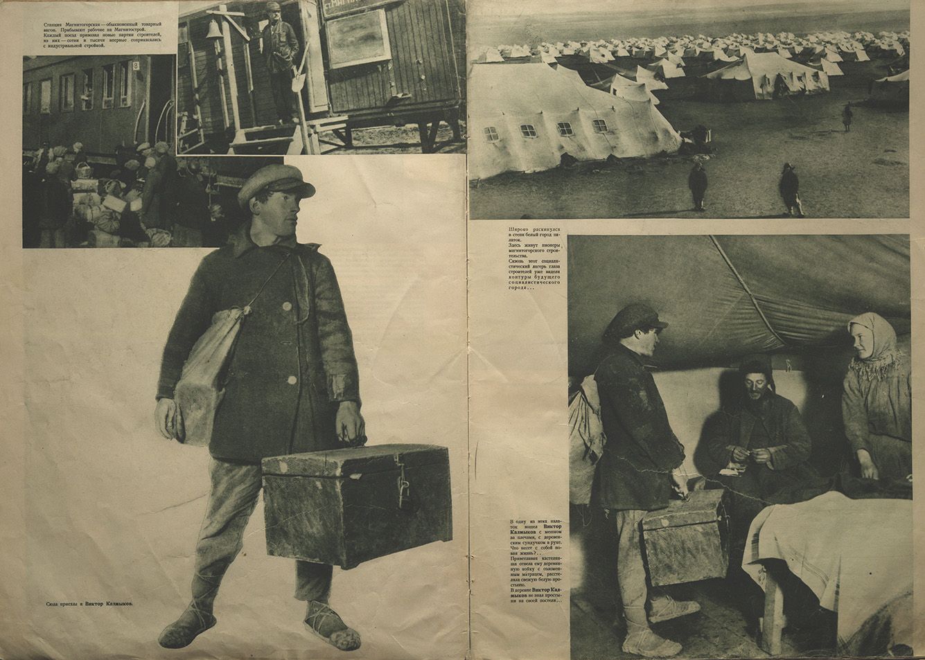 На жесткой скамейке железнодорожного вагона сидит, снятый первым планом, нескладный деревенский парень в зипунах и лаптях. В ногах у него обыкновенный деревянный сундучок с нехитрым имуществом. Это и был герой нашего фотоотчета — Виктор Калмыков, строитель, один из многих тысяч таких же деревенских парней, приехавших со всех концов страны на уральскую новостройку возводить гигант металлургии