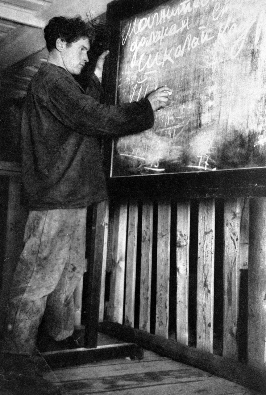 Можем ли мы с такой смелостью брать человека и воспроизводить его «минувшие дни» с начала до конца, пройденные этапы? В серии т. Альперта произошел целый ряд ошибок, О таких ошибках, как перевязанный палец, который выдает, что эта серия сделана не на протяжении ряда месяцев, а на протяжении короткого промежутка времени, я уже не говорю. Но вот другой момент: Калмыков на доске изучает геометрию, [хотя] понятно, что ему еще очень далеко до геометрии или алгебры.