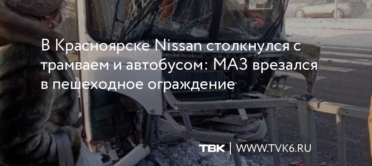 В Красноярске Nissan столкнулся с трамваем и автобусом: МАЗ врезался в пешеходное ограждение