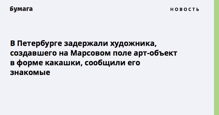 В Петербурге задержали московского художника Ивана Волкова, который создал арт-объект в форме фекалии из снега на Марсовом поле. Об этом «Бумаге» сообщила его подруга — автор телеграм-канала Young Artists & Collectors Club Мария Крючкова.