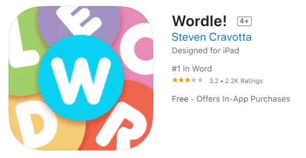 Среди свежих подделок выделяется игра Wordle! — несмотря на идентичный заголовок, правила головоломки отличаются, а появилась она в 2017 году. За это время приложение установили немногим больше ста тысяч человек, а его автор разочаровался в работе и почти сразу перестал её поддерживать. Но на фоне интереса к новой игре проект набрал неожиданную популярность.