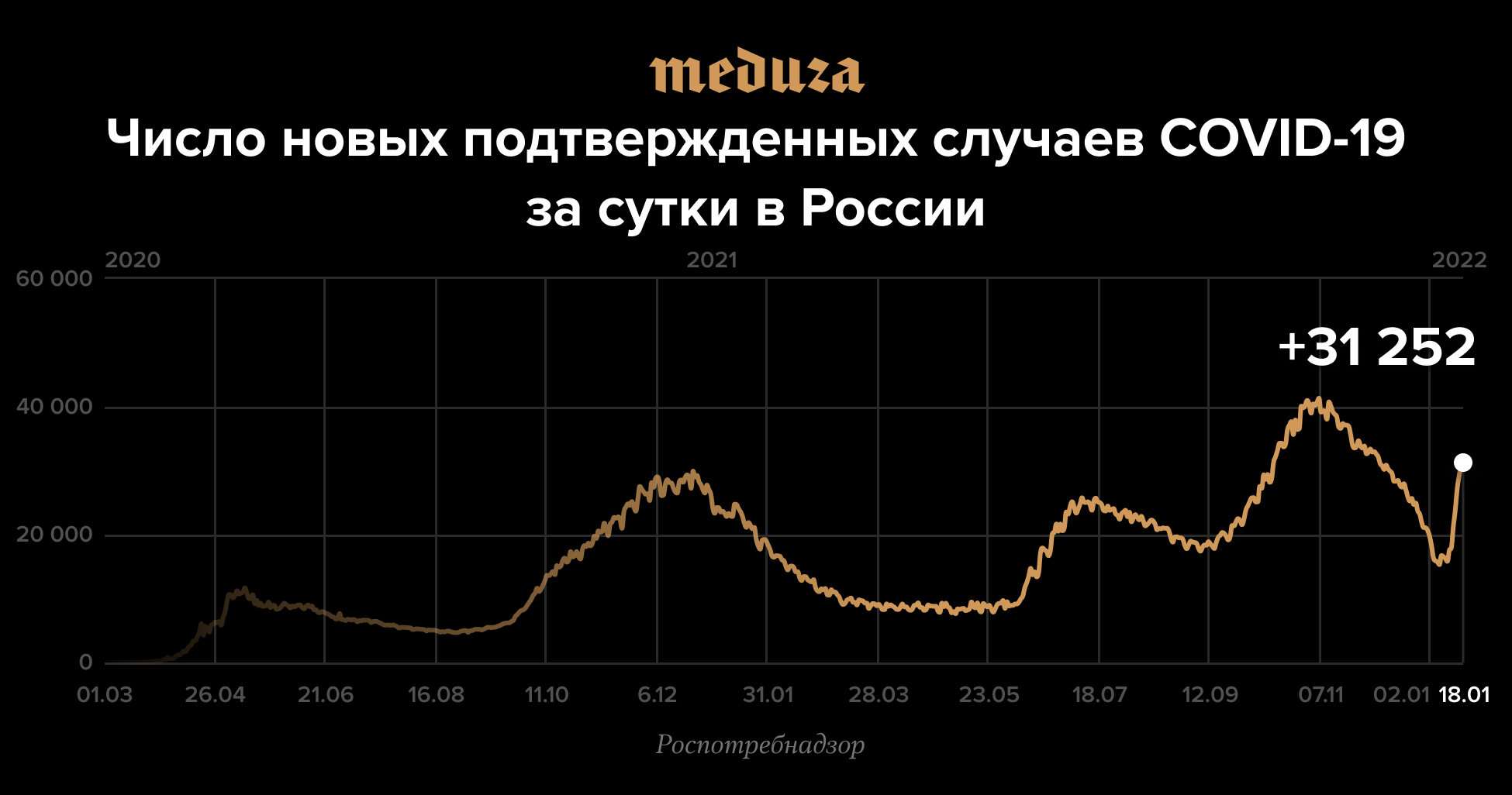 В России за сутки выявлено 31 252 новых случая коронавирусной инфекции, сообщил 18 января федеральный оперативный штаб по борьбе с COVID-19. Это максимальный показатель суточной заболеваемости с 6 декабря.