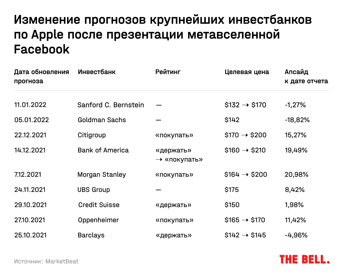 Многие инвестбанки в последние месяцы повысили таргет по акциям Apple (см. таблицу ниже): с октября 2021-го по январь 2022-го консенсус-прогноз аналитиков с Уолл-стрит вырос со $144 до $176 (текущая цена акций — $172), следует из данных сайта Marketbeat. В июне 2020-го таргет составлял $82, а в январе 2021-го — $131.