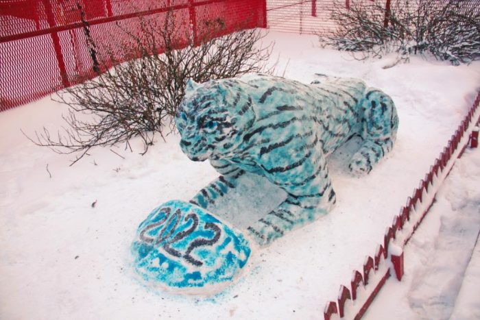 - На Крестовском острове появился огромный тигрозавр из снега. Вот как он выглядит.