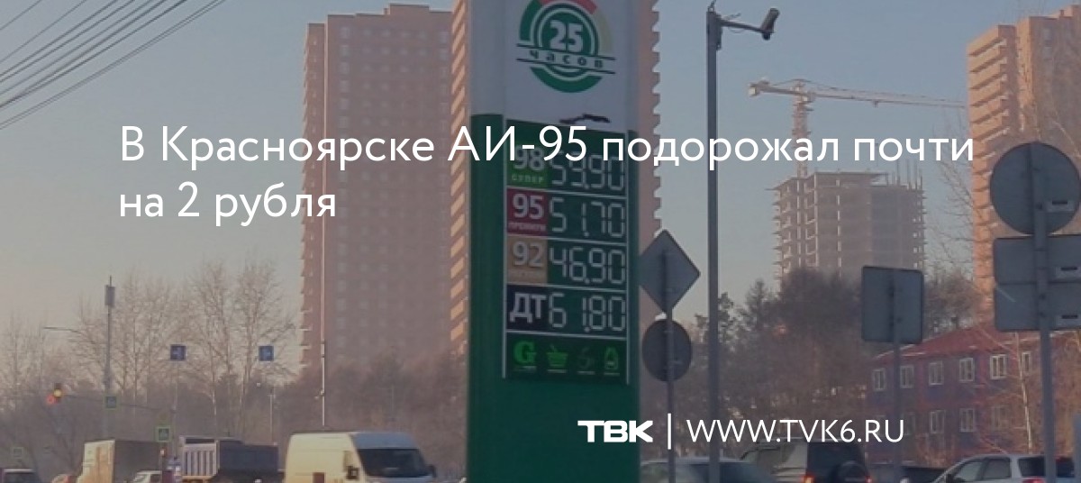 20 января в Красноярске цена за литр 95-о бензина выросла на 2 руб. – теперь он стоит 51 руб. 70 коп. Еще 19 января цена за литр этого топлива была 49 руб. 90 коп. Кроме того, выросла цена и на дизельное топливо – до 61 руб. 80 коп.