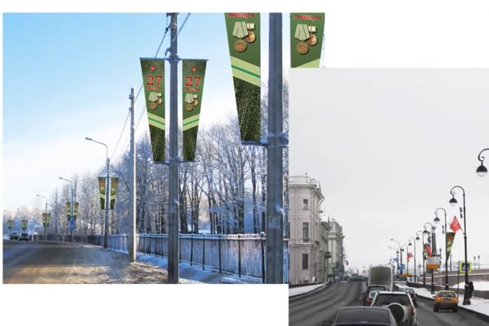 «Всего запланировано 2,5 тысячи единиц праздничного оформления по 45 адресам», — рассказал глава комитета. По словам чиновника, в элементах оформления используют знаки «Житель блокадного Ленинграда» и медаль «За Победу».