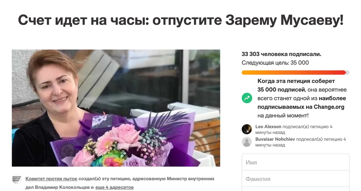 На сайте Change.org опубликовали петицию с требованием освободить Зарему Мусаеву, жену федерального судьи в отставке Сайди Янгулбаева, которую силовики вывезли из Нижнего Новгорода в Грозный. Петицию подписали уже больше 33 тысяч человек.