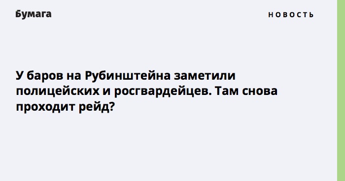 «У нас такой информации [о новом рейде] нет. Часть заведения в данный момент не работает, потому что у нас график работы — с четырех дня. Что на улице Рубинштейна делают сотрудники Росгвардии, мы не можем сказать, потому что не в курсе. Возможно, просто приятно проводят время», — прокомментировала ситуацию представительница бара.