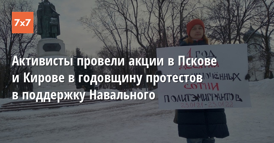 В российских городах 23 января прошли акции в годовщину протестов 2021 года в поддержку Алексея Навального. В Кирове активисты провели митинг с требованием прекратить политические репрессии и освободить политзаключенных, а в Пскове на одиночный пикет вышла местная жительница. Об акциях «7х7» рассказали активисты Вадим Ананьин и Екатерина Новикова.