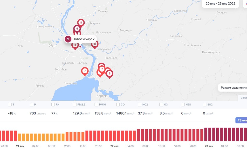 Новосибирск накрыло дымкой 23 января. По данным сервиса мониторинга качества воздуха, уровень загрязнения достиг опасных, почти максимальных, значений.