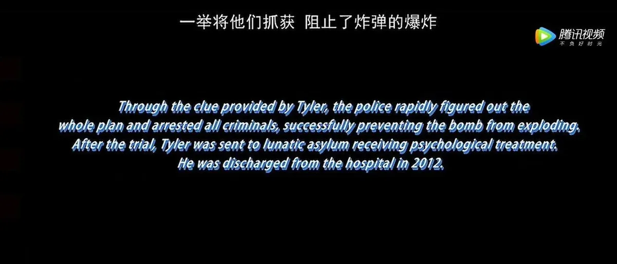 Из китайской версии эту сцену вырезали, а в качестве финала показали титр, в котором говорится, что полиция воспользовалась подсказкой Тайлера и обезвредила бомбу, а главного героя доставили в психиатрическую больницу, откуда он вышел в 2012 году.