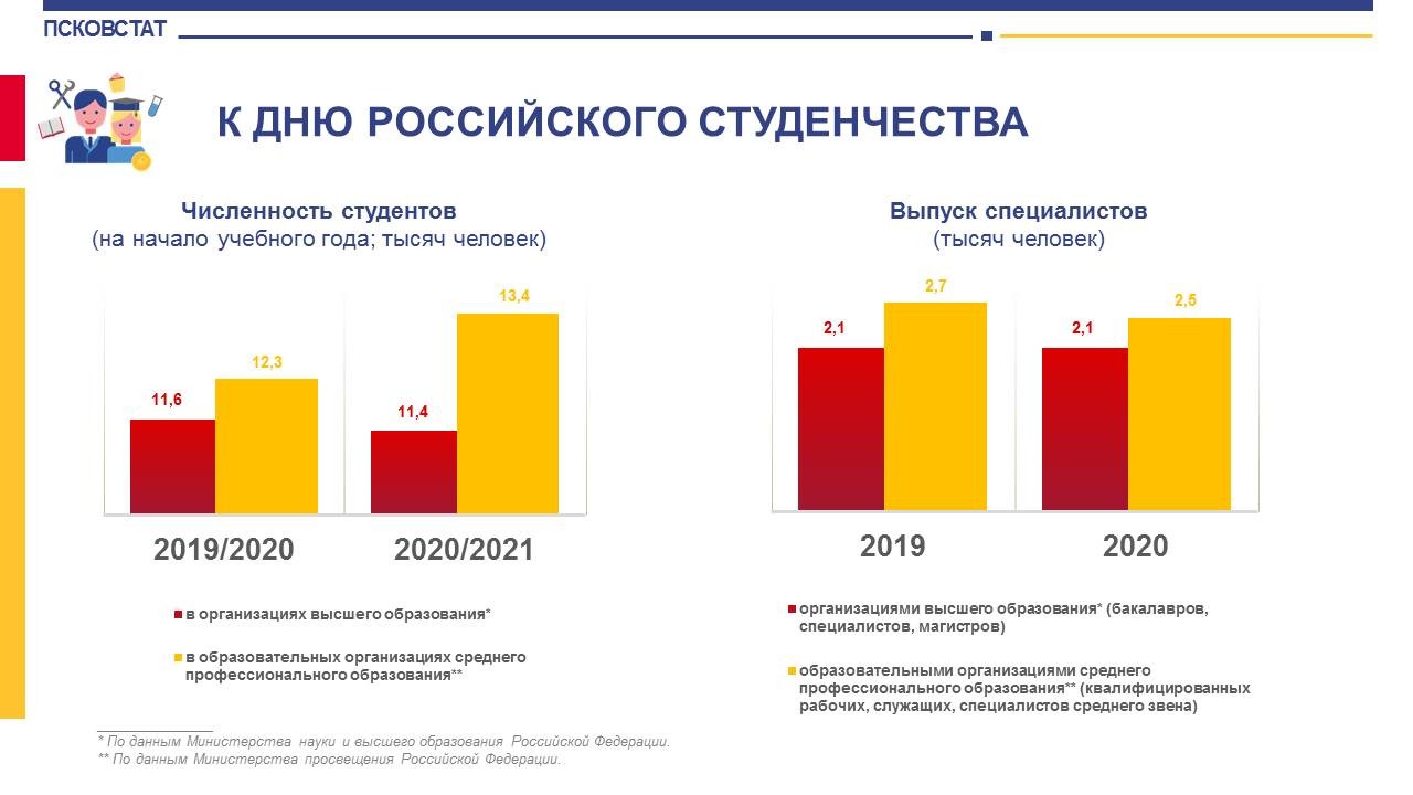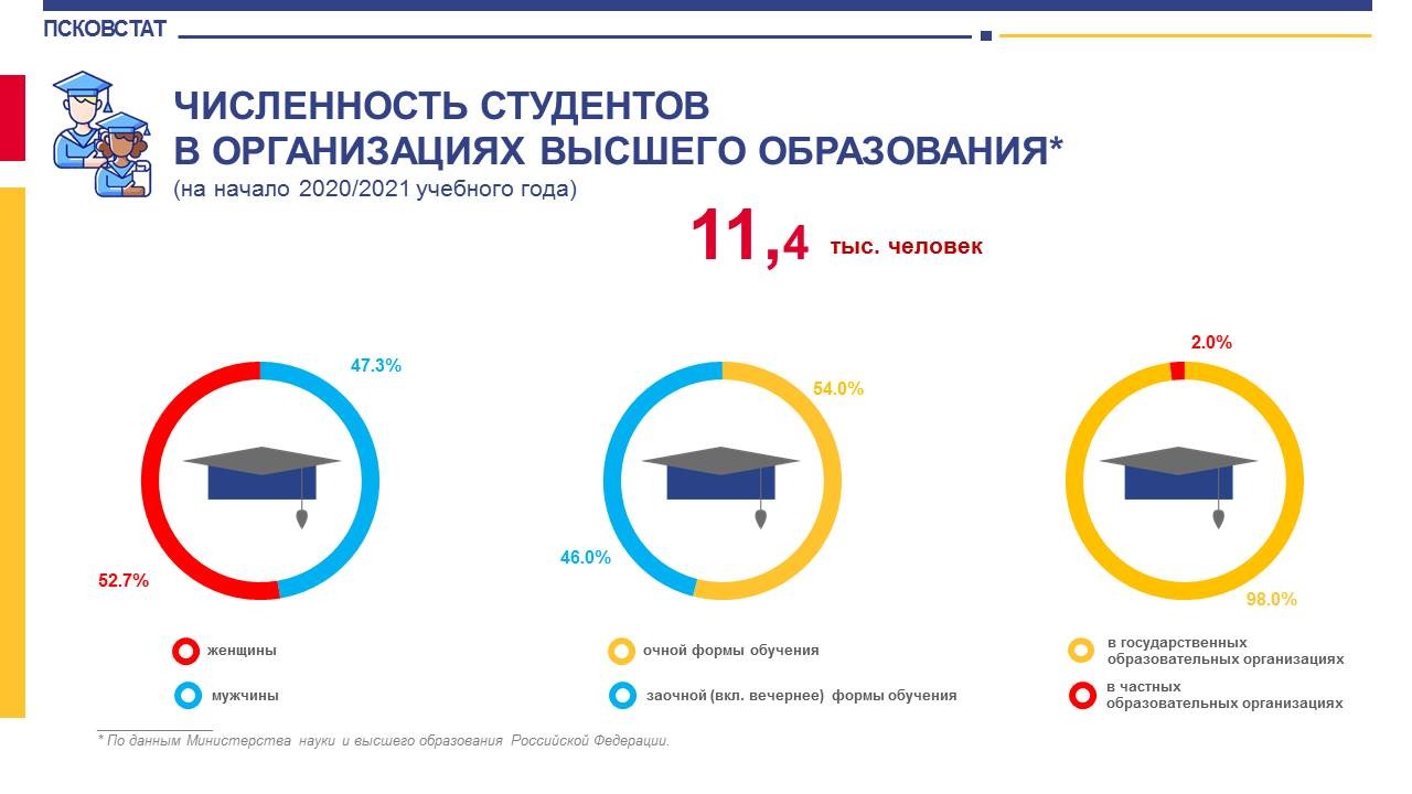 В прошлом учебном году 2020-2021 гг. в Псковской области насчитывалось почти 25 тысяч студентов, получавших образование в организациях высшего и среднего профессионального образования: по данным Псковстата, высшее образование по программам бакалавриата, специалитета и магистратуры в минувшем году получали 11,4 тысячи студентов, что на 1,8 процента меньше, чем в предыдущем году.