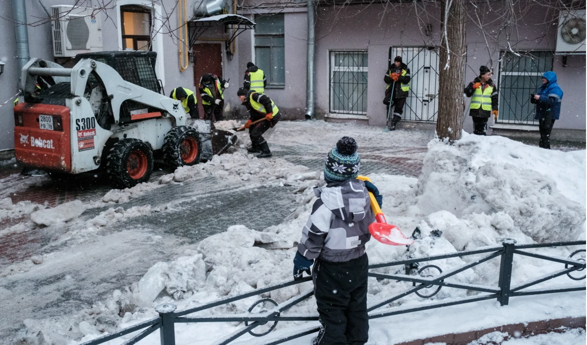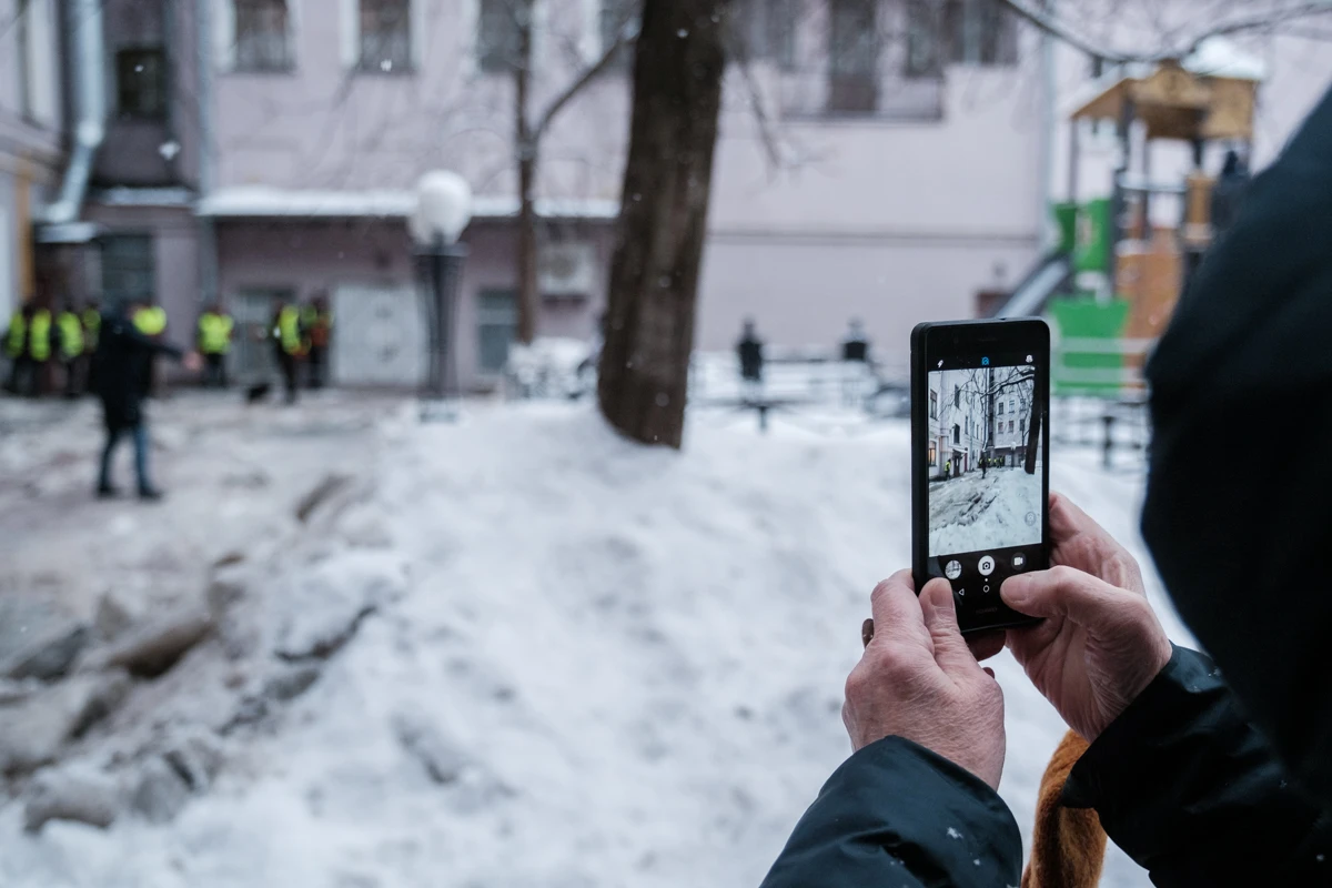 Начальники стоят неподалеку и снимают процесс на видео — двое мужчин и женщина в синей накидке с надписью «Евро Сити», одной их крупнейших управляющих компаний. На вопрос, сколько строителей оторвали от работы и привезли на авральные работы по уборке города, один из мужчин отвечает: «Это военная тайна: Идите в «Жилкомсервис», там сегодня, несмотря на выходной, все работают безостановочно. А мы люди маленькие, отстаньте от нас.