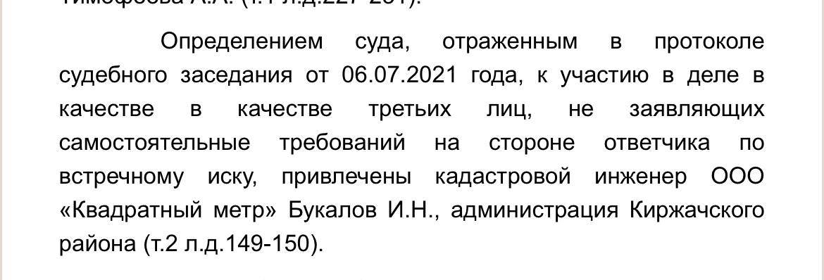 «Однако, к нашему удивлению, суды встали на сторону…. Дело в том, что на момент проведения работ по межеванию границы земельного участка заявителей были уже уточнены, а сам участок состоял на кадастровом учете. В связи с этим граница этих участков общая, ранее уточнённая. Гусевой Т. Ю. я говорил, что никогда не был кадастровым инженером. Это уже всем известная тактика.