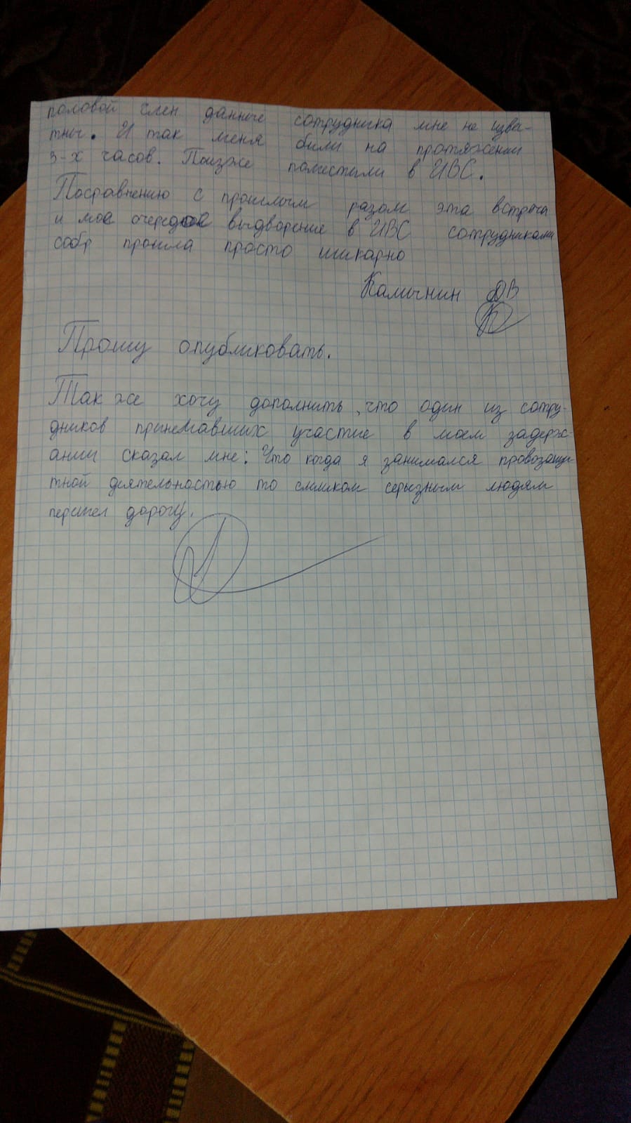 После меня повезли в ИВС. За то время, пока я находится в Кировском райотделе, моя мама успела купить мне несколько бутылок минеральной воды и передать мне. .. меня мучила сильная жажда, я попросил разрешения у одного из сотрудников СОБР попить, после чего сотрудник достал бутылку у меня из сумки ударил меня ей по голове и часть содержимого бутылки вылил мне на голову, – пишет Дмитрий. –Примечательно, что один из сотрудников, принимавших участие в моем задержании сказал мне, что когда я занимался правозащитной деятельностью то слишком серьезным людям перешел дорогу".