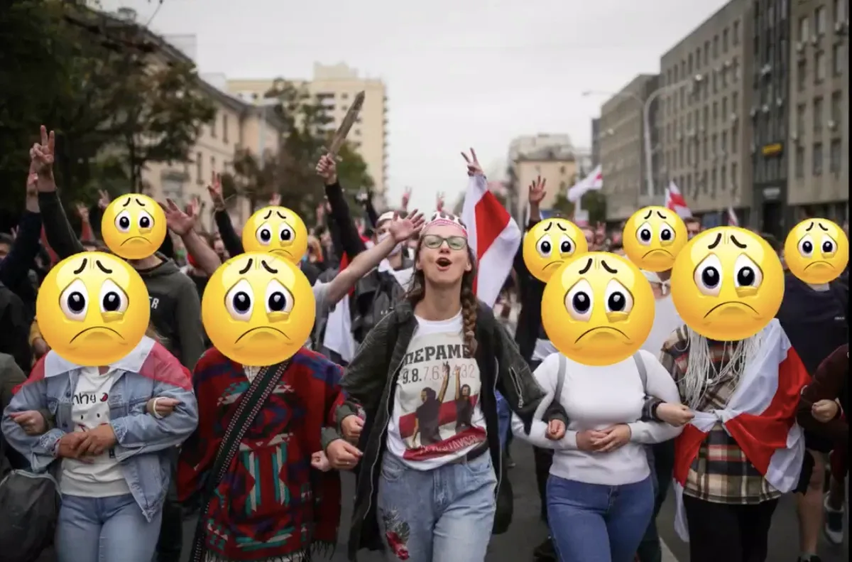 После этого на записи показан снимок, где предположительно Цвикевич идет по Минску, взявшись за руки с другими участниками акции. На снимке фигура Цвикевич некачественно вмонтирована в «сцепку». Лица девяти человек, находящихся на первом плане фото, закрыты грустными смайлами.