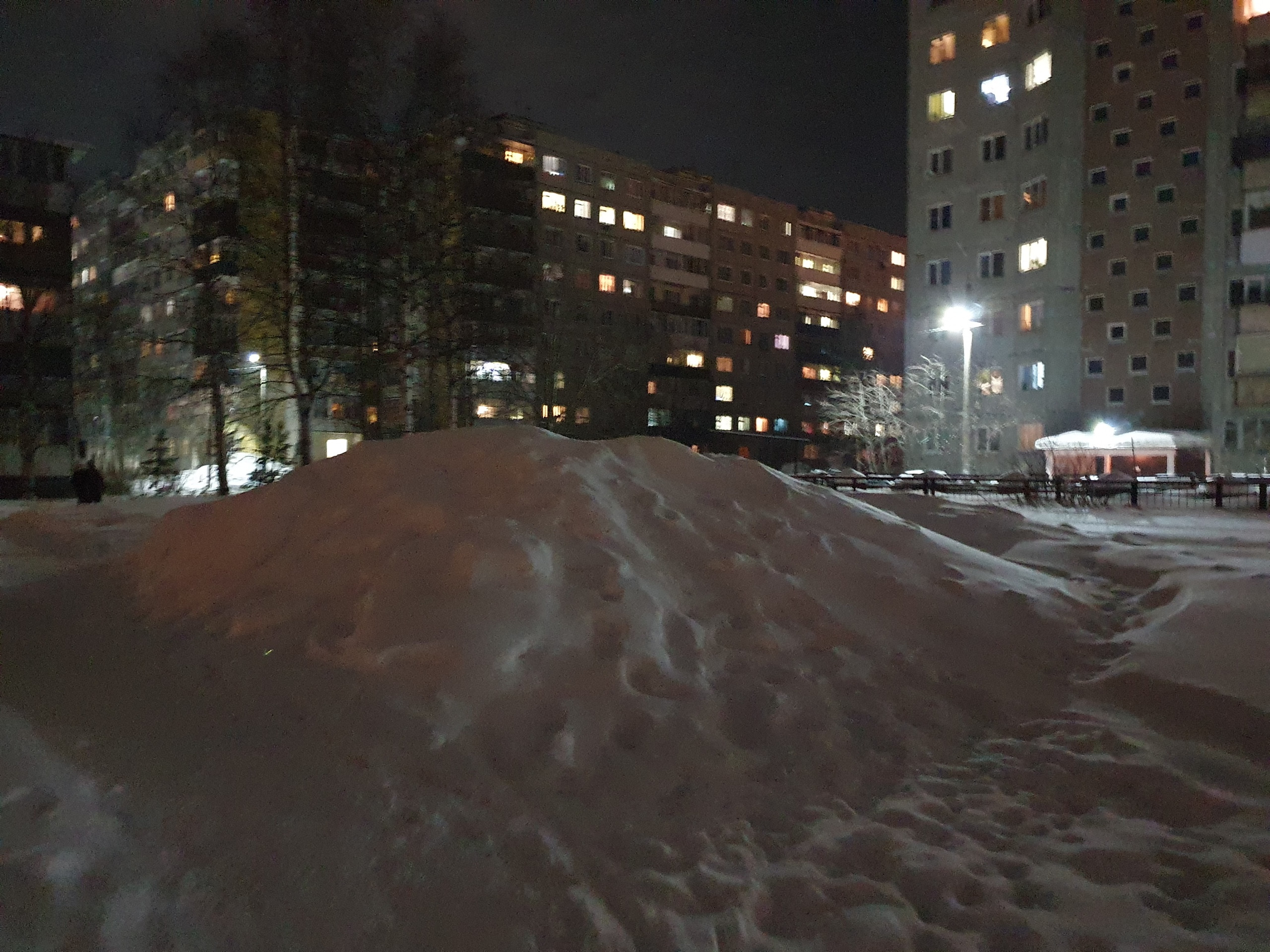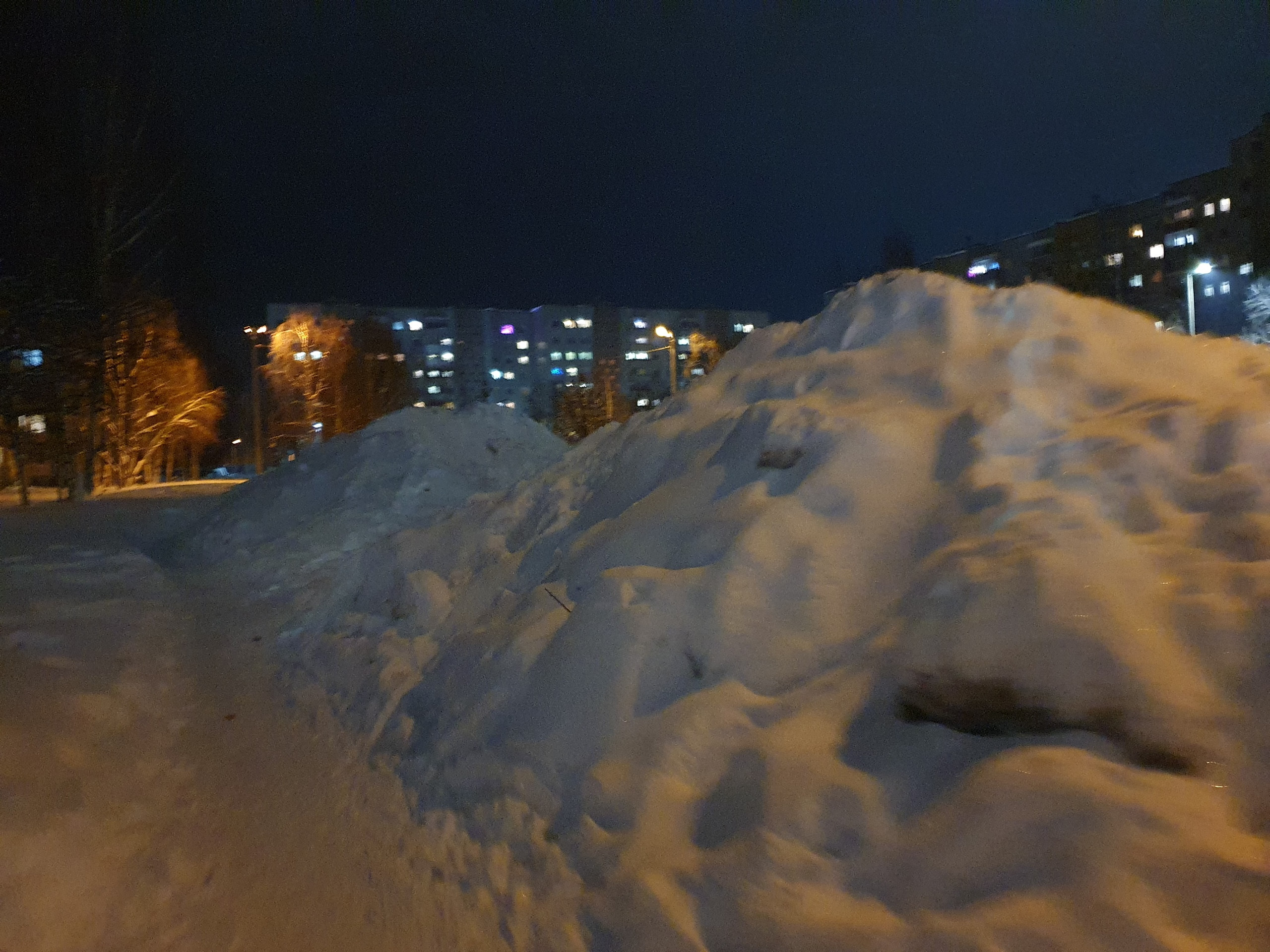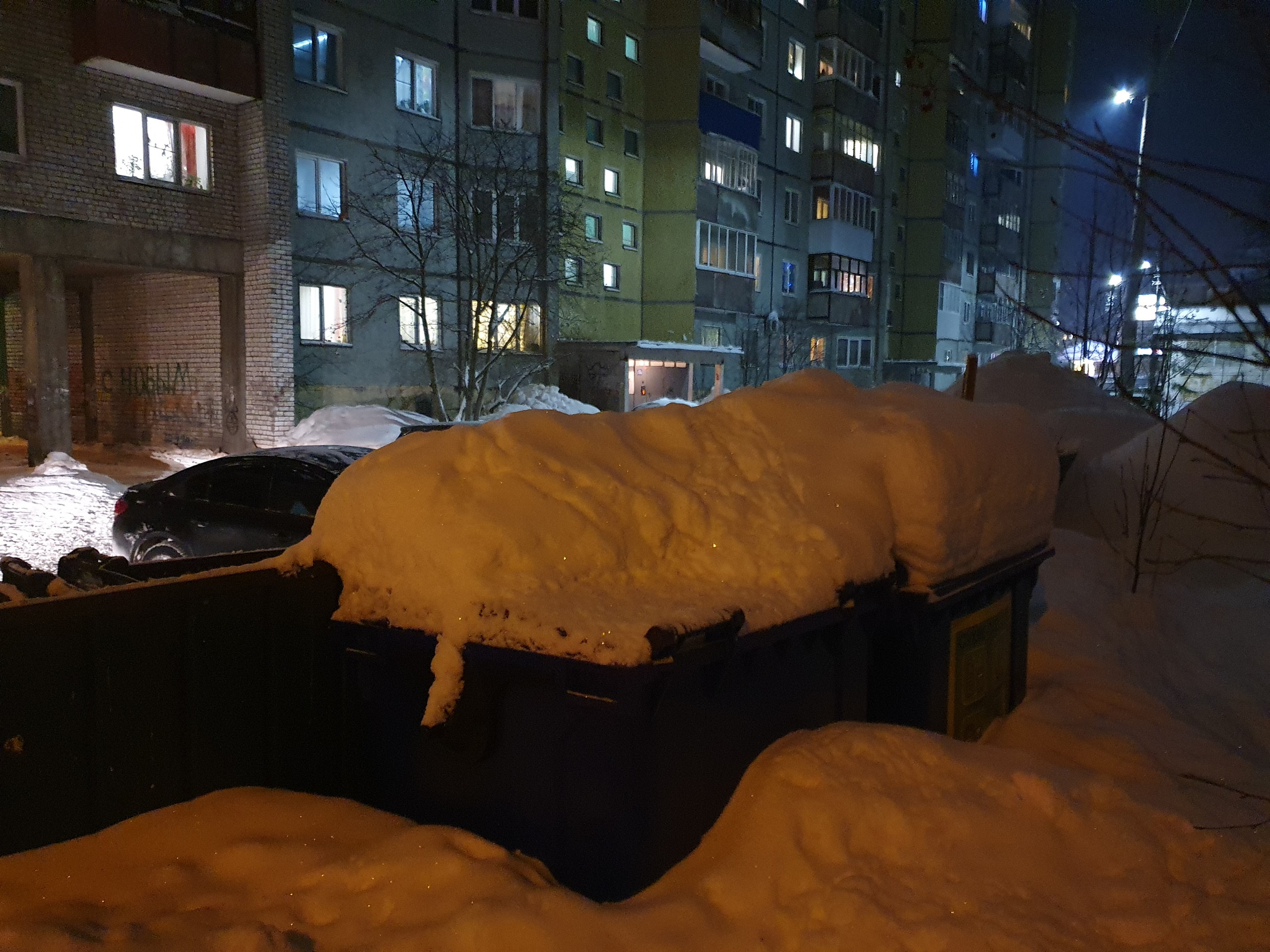 Навалены кучи снега в центре (как они туда попали?), мусорные баки для раздельного сбора стоят за контейнерной площадкой и, конечно же, не используются.