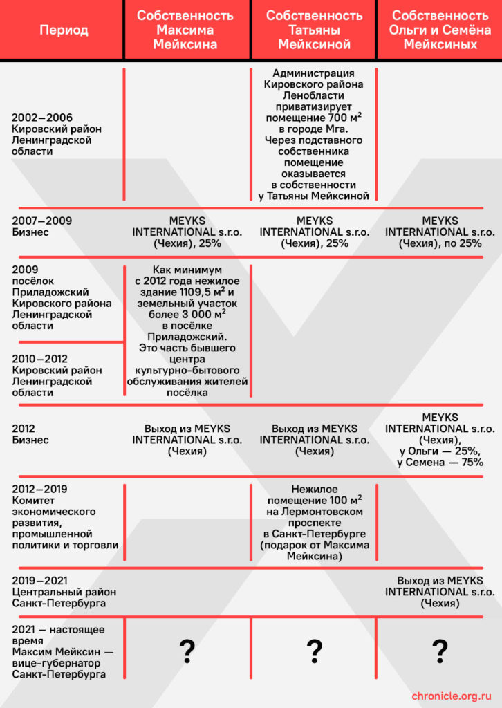 Вот такие шесть профессиональных черт нового заместителя Беглова. Смешно, что на каждом этапе государственной карьеры Мейксина его семья получала коммерческую недвижимость именно в тех местах, где работал чиновник — не важно, Петербург это или посёлок в области.
