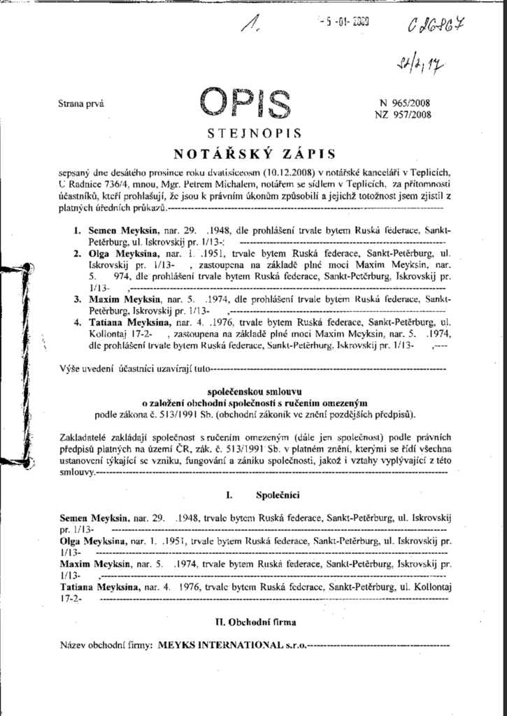 Подозрительно! Мы копнули поглубже и обнаружили, что в конце 2008 года Мейксин со своей женой и родителями создал коммерческую компанию в недавно официально признанной недружественной Чехии — MEYKS INTERNATIONAL s.r.o.