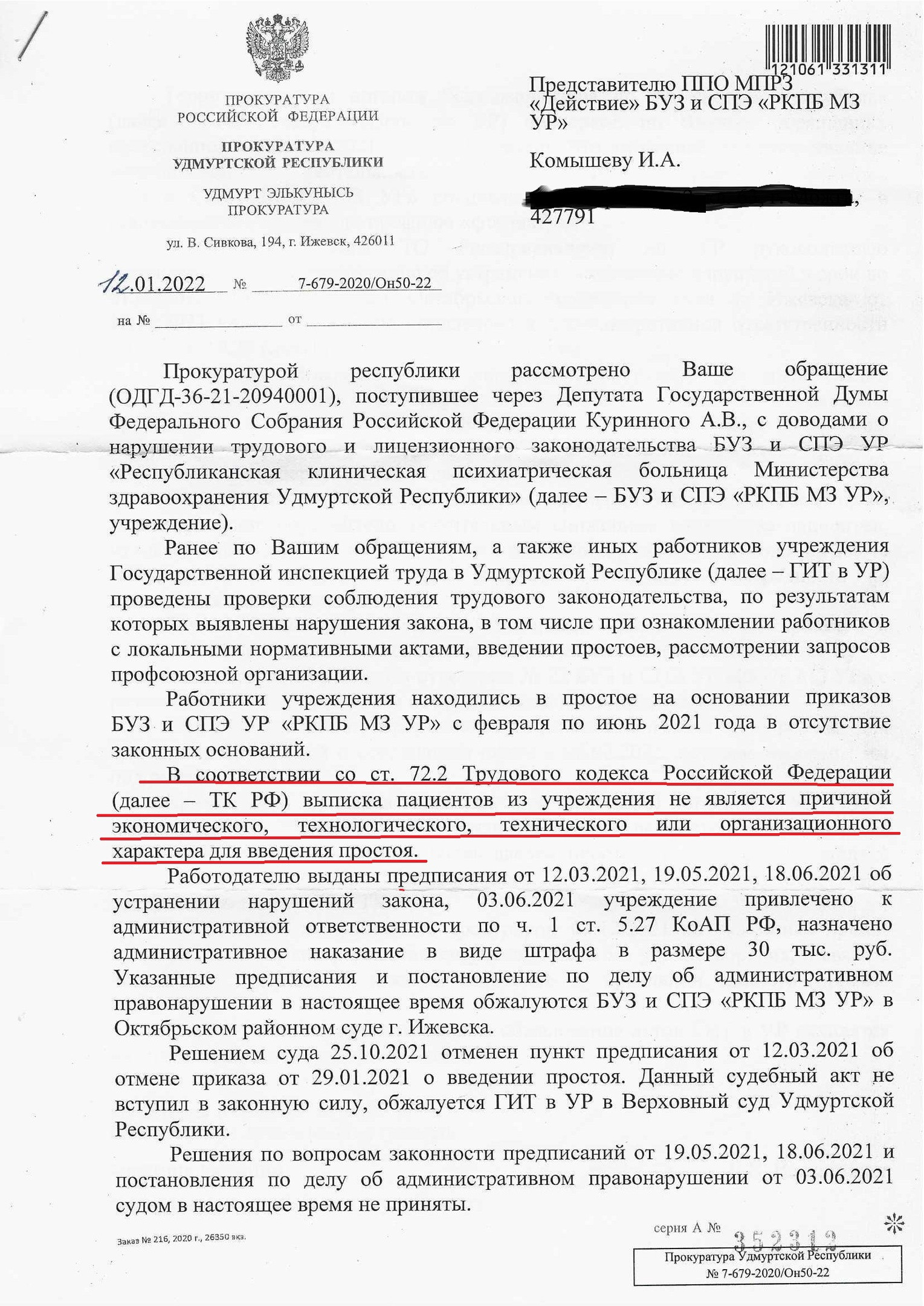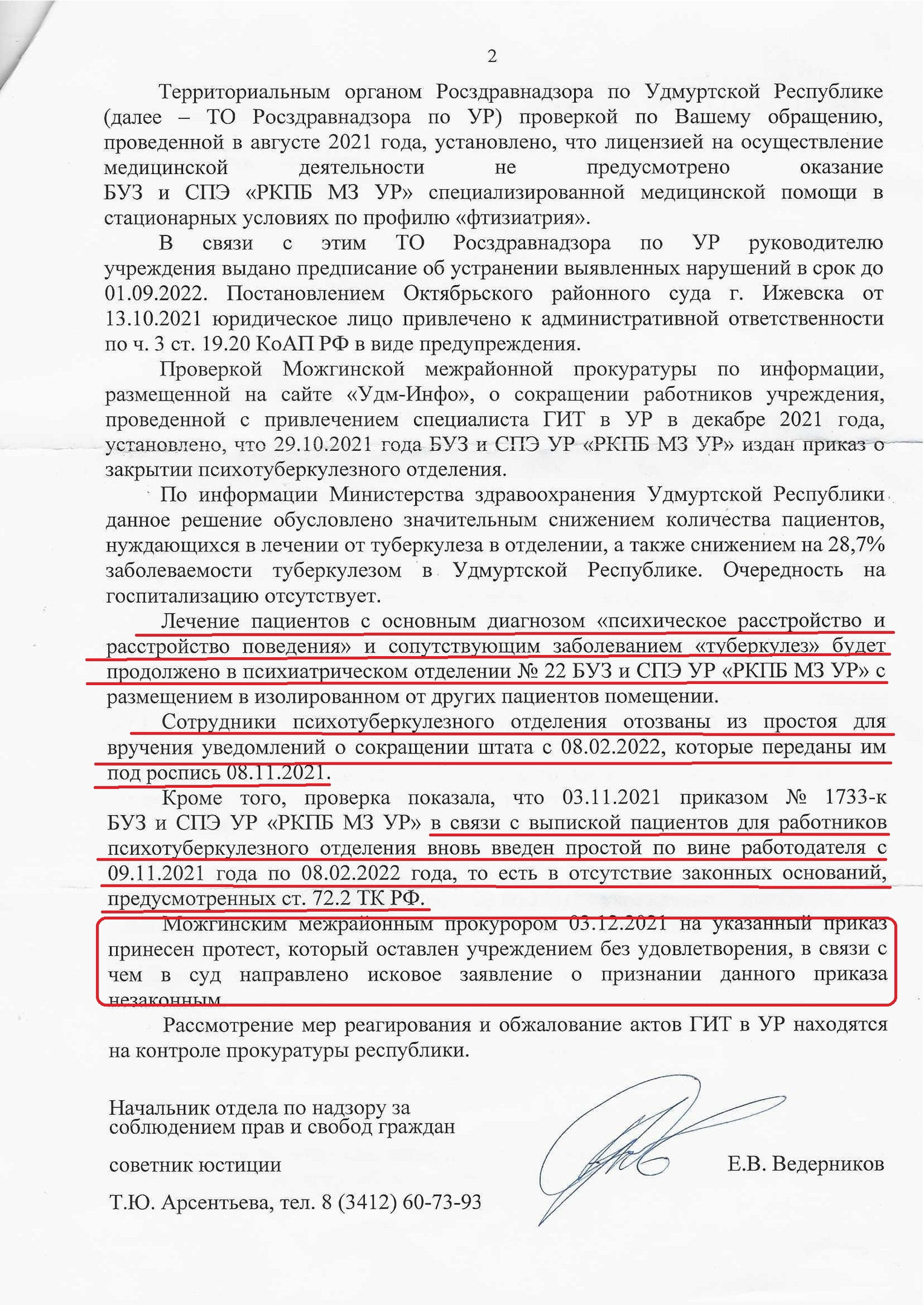 Во-первых, как следует из ответа Прокуратуры Удмуртии, куда был вынужден обратиться профком профсоюза «Действие», «лечение пациентов с основным диагнозом «психическое расстройство и расстройство поведения» и сопутствующим заболеванием «туберкулез» будет продолжено в психиатрическом отделении №22. То есть, получается, что довод Каменщикова о том, что причина закрытия психотуберкулезного отделения – сокращение числа пациентов с туберкулезом – не соответствует действительности? И тогда зачем закрывать психотуберкулезное отделение №20? Чтобы перевести пациентов в психиатрическое №22, сотрудники которого не имеют опыта работы с больными, имеющими диагноз «психическое расстройство» и «туберкулез»?