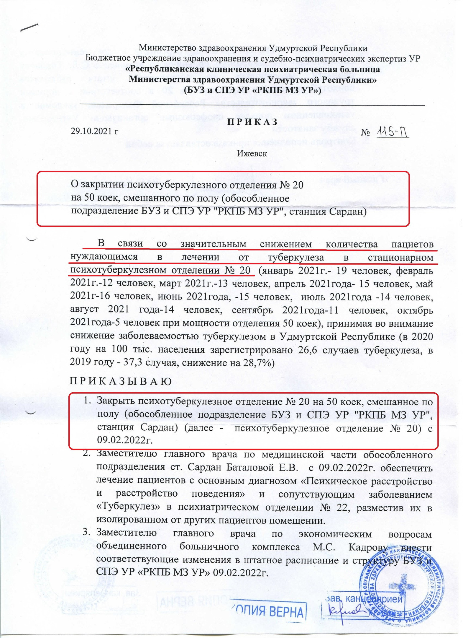 Однако, как и следовало ожидать, все эти предвыборные обещания остались очередным пиаром и улетучились сразу после подведения итогов голосования – главный врач РКПБ Юрий Каменщиков выносит приказ №115-П от 29 октября, которым принимает решение о закрытии единственного в Удмуртии психотуберкулезного отделения №20 на 50 коек. Особый цинизм данной ситуации придает тот факт, что решение о закрытии этого отделения принимается в период пандемии коронавируса! И тут важно отметить, что формулировки, озвученные в данном приказе, в очередной раз вызывают массу вопросов и подводят к мысли, что все эти действия приняты с грубейшими нарушениями закона.