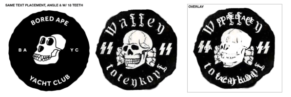- По мнению Риппса, логотип BAYC отсылает к эмблеме третьей танковой дивизии СС «Мёртвая голова». Помимо цвета, формы и самого черепа, на обоих рисунках изображены 18 зубов — этим числом обозначали имя Адольфа Гитлера.