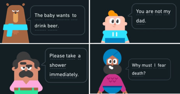 Duolingo — бесплатное приложение для изучения иностранных языков. Оно построено по принципу геймификации и предлагает ученикам проходить различные короткие задания. В одном из таких необходимо перевести фразу, составив предложенные слова в правильном порядке. Сами предложения выдаются случайно, поэтому иногда могут содержать неожиданные конструкции.