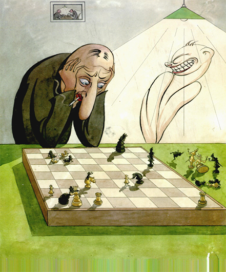 © Предоставлено семьей Е.Н. Рейтлингер Шахматы взбесились. Без даты«На доске происходит нечто противоестественное (братание черных и белых, любовь белой королевы и черного короля, черная королева плачет), и шахматист в полной прострации. Муж Екатерины Рейтлингер (Кист) увлекался шахматами». Когда глядишь на графику Рейтлингер, довольно очевидным становится «вывоз» с собой в эмиграцию модерна, дефицита которого, впрочем, в Праге не было; в то же время этот багаж говорит о готовности усваивать иное, еще не опробованное. Трудно добраться до источников в случае Рейтлингер, которые к тому же часто безотчетно усваиваются авторами. Мы можем приблизительно представить пражский «расклад» обстоятельств. В него входит перенос, с точки зрения обстоятельства места, в город с сохранившимися памятниками Средневековья, активно работающими на среду и образ этого города. Затем — личный опыт повторения на заказ медиевистских мотивов в интерьерах и декоративно-прикладном искусстве. И третье — это пестрый котел живописи и графики Германии, Австрии, Франции, Италии того времени. Исходя из этого, мы можем попытаться нащупать некоторые составные. Среди них ракурсы и планы графики модерна, приоткрытая завеса вакуумности новой вещественности, сюрреалистическая прихотливость и мрачная язвительность немецкого межвоенного экспрессионизма. Звучит довольно громоздко, но стоит понимать, что Рейтлингер берет от всего совсем понемногу: ведь для нее первостепенны сюжет, сами персонажи и, скажем так, причины уродства — похоть, ехидство, страх, обывательщина и прочее.