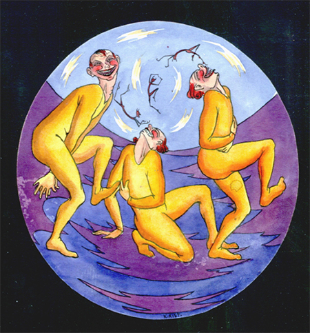 © Предоставлено семьей Е.Н. Рейтлингер Смехунчики. Без даты«Екатерина Николаевна считала, что на людей нападает беспричинный смех не сам по себе, а в результате того, что на человека нападают “смехунчики”». Чешский сюрреализм имеет свою заметную историю в контексте общеевропейского, на сторону его веса можно было бы даже подтянуть тот факт, что в Праге дважды за 1935 год выступает с докладами об эстетике сюрреализма француз Андре Бретон, один из основоположников направления; в том же году выходит первый Международный бюллетень сюрреализма, но все это, конечно, из разряда хроники, а не оснований. Пожалуй, в нашем случае есть одна смысловая точка пересечения с сюрреализмом, базирующимся на подсознательном, неявленном и метафизическом, и она в убеждении и цитате Рейтлингер: «Каждое существо, даже камни, эманирует какое-то излучение. Это излучение, проходя через преграды, стены, деревья, оставляет следы. И можно всегда столкнуться с этими проявлениями». Очевидно, многие люди в ее глазах эманируют довольно скверное «излучение» ввиду своей ничтожности и духовной незрячести. Тут, кстати, можно вспомнить и о понятии эманации в иконописи, которой занималась Юлия Рейтлингер (с. Иоанна). Две почти противоположные по характеру эманации находят место в работах сестер: эманация низменного у одной и божественной благодати — у другой.
