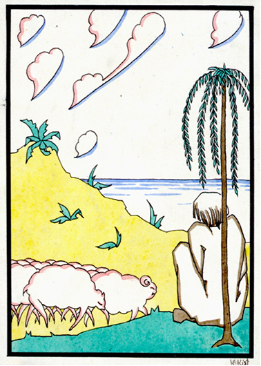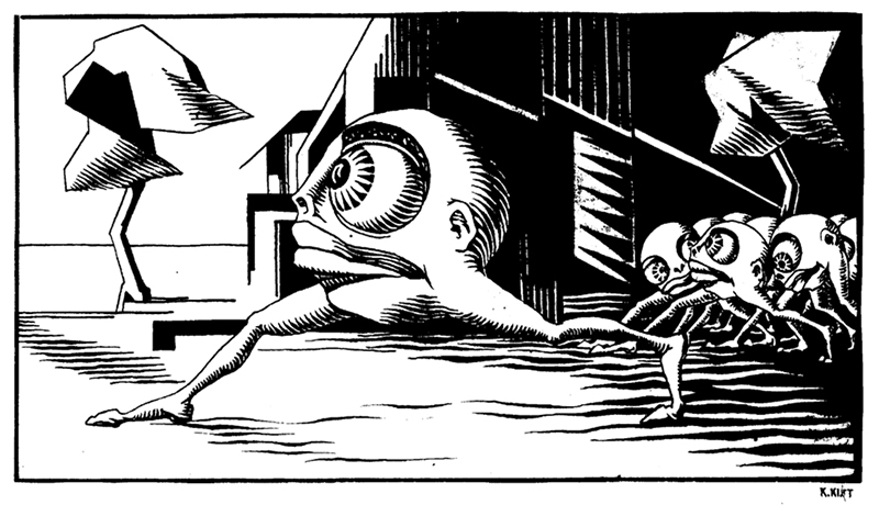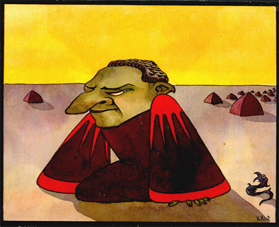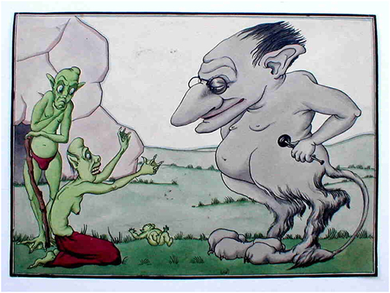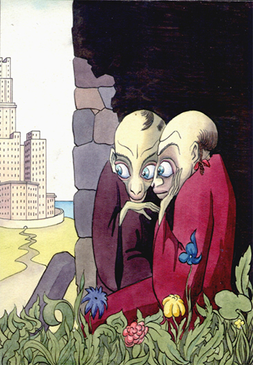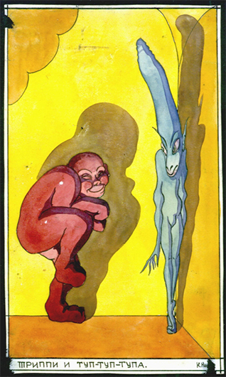 Что это за персонажи? Почему они так нарочито уродливы? Что с ними происходит и почему? Некоторые картинки можно отнести как будто к карикатурам, идея которых не до конца понятна, а жестокость «некрасивости» в создании образов немного настораживает. Все-таки они стоят в стороне от карикатур: слишком часто подмешано что-то хтоническое, слишком важна среда, в которой обитают персонажи. Период создания работ позволяют определить приметы материальной культуры, но их форма достаточно синтетична. Мне видятся здесь и книжная иллюстрация, и миниатюра, и плакат, наив и лубок, и архитектурная графика, и сюрреалистические веяния… И при этом на «домашнем» (если так можно выразиться), не для показа, уровне. Возникает вопрос — кто и зачем создавал эти специфические, неоднозначные работы?
