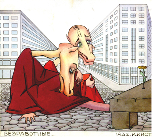 © Предоставлено семьей Е.Н. Рейтлингер (Кист) Безработные. 1932«Пара, напоминающая Алексея и Екатерину Кист, отчаялась найти работу. Город построен. Он чист и убран. Никому не осталось никакой работы. Делать нечего, работы нет и не будет, заработать негде и нечем». Многообразие мира и плотность визуально представляемого, ставшие доступными в любых деталях и масштабах, вводят в растерянность и снимают необходимость давать итоговые оценки. Поэтому здесь меня, скорее, интересовало не куда отнести, между кем или чем поставить эти картинки, а что это вообще такое. Зачем и почему молодая женщина, живущая в Праге, рисовала подобных героев — и, конечно, почему они такие уродливые. Или наоборот — кто создал их и какие для этого были основания?
