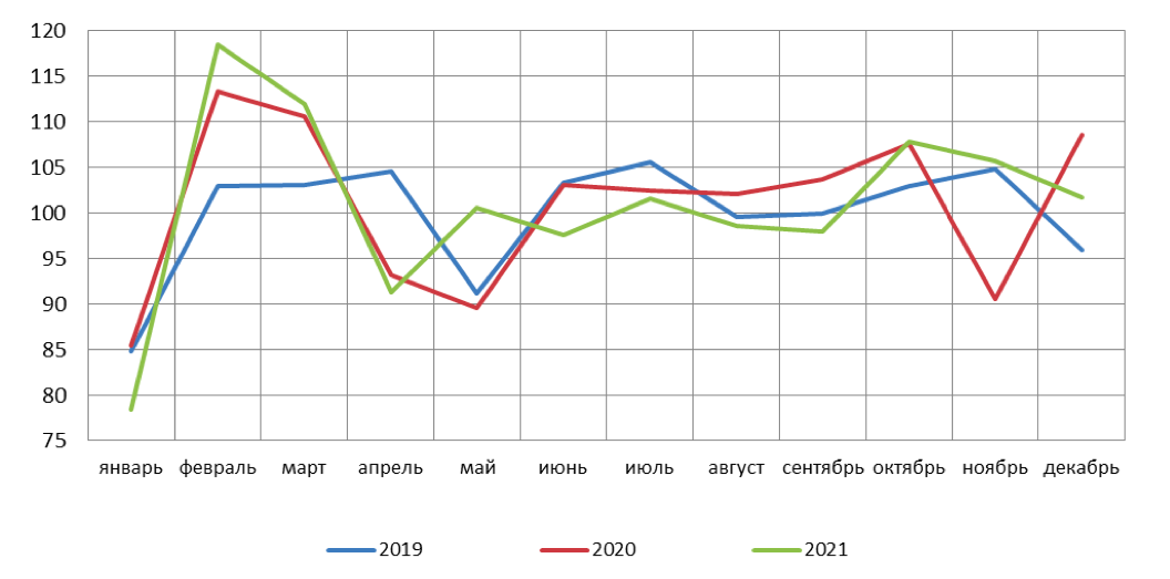 Индекс промышленного производства в Псковской области в январе-декабре 2021 года к уровню января-декабря 2020 года составил 104 процента: по данным Псковстата, в декабре 2021 года к уровню декабря 2020 года индекс промышленного производства составил 102,8 процента, к уровню ноября 2021 года – 101,7 процента.
