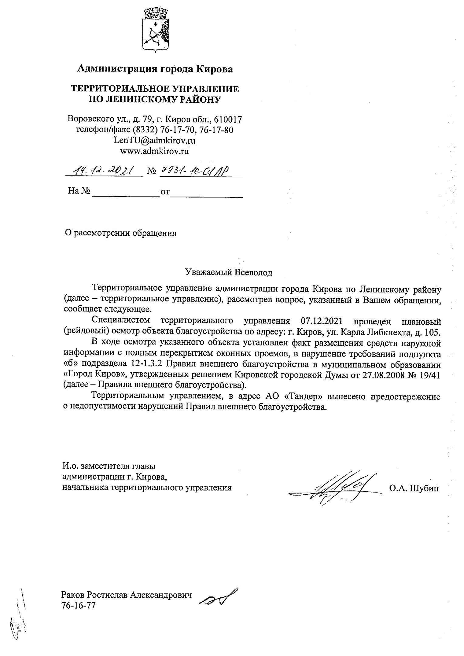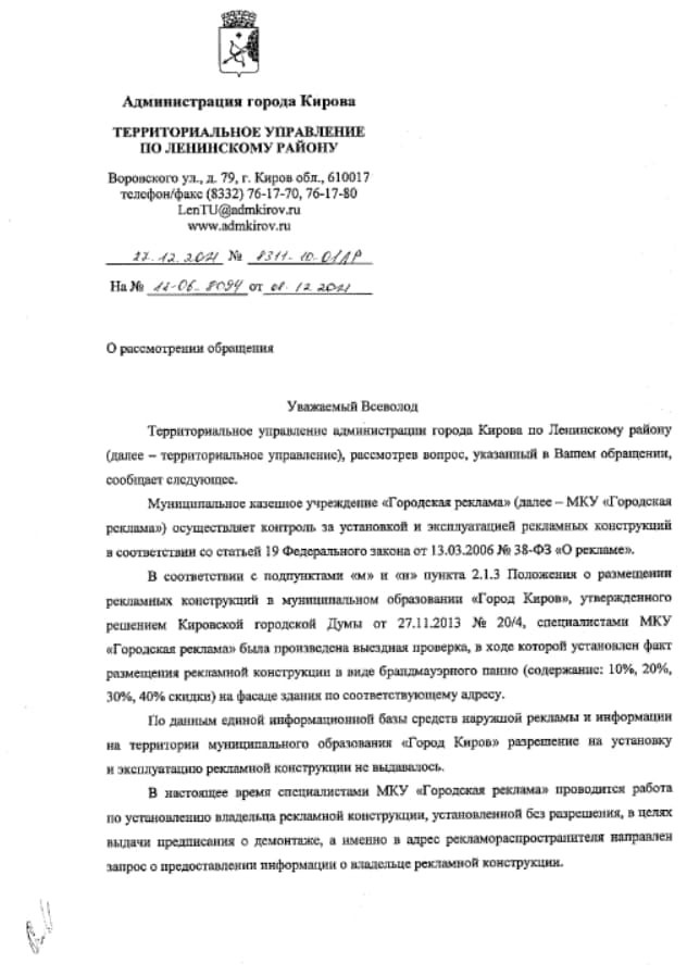 Как в таком случае надо действовать? К примеру, берем баннеры на Комсомольской, 8. Делаем фотографии - заходим в приложение или на сайт, ищем на карте нужный адрес - в обращении пишем: "По адресу: г. Киров, ул. Комсомольская, 8 размещены рекламные конструкции, которые могут быть установлены незаконно без разрешения и с нарушением Правил внешнего благоустройства. Прошу принять меры" - выбираем адресата (администрация города Кирова) - отправляем и ждем ответа в течение 30 дней.