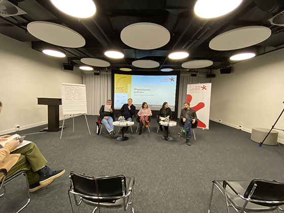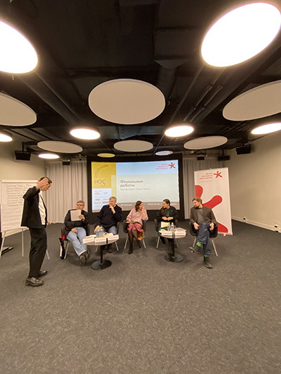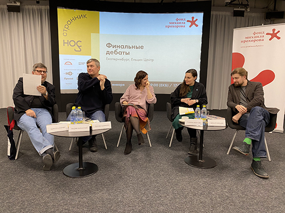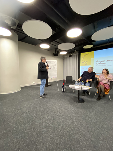 Перед флипчартом встает Александр Бакин, руководитель отдела образовательных программ Ельцин Центра. Рассказывает о «Страннике/Носе» и о том, что Ельцин Центр рад принимать премию. Особо подчеркивает, что одна из ключевых тем со дня основания премии — это децентрализация, поэтому дебаты отлично вписываются в программу центра. Передает слово К.К..