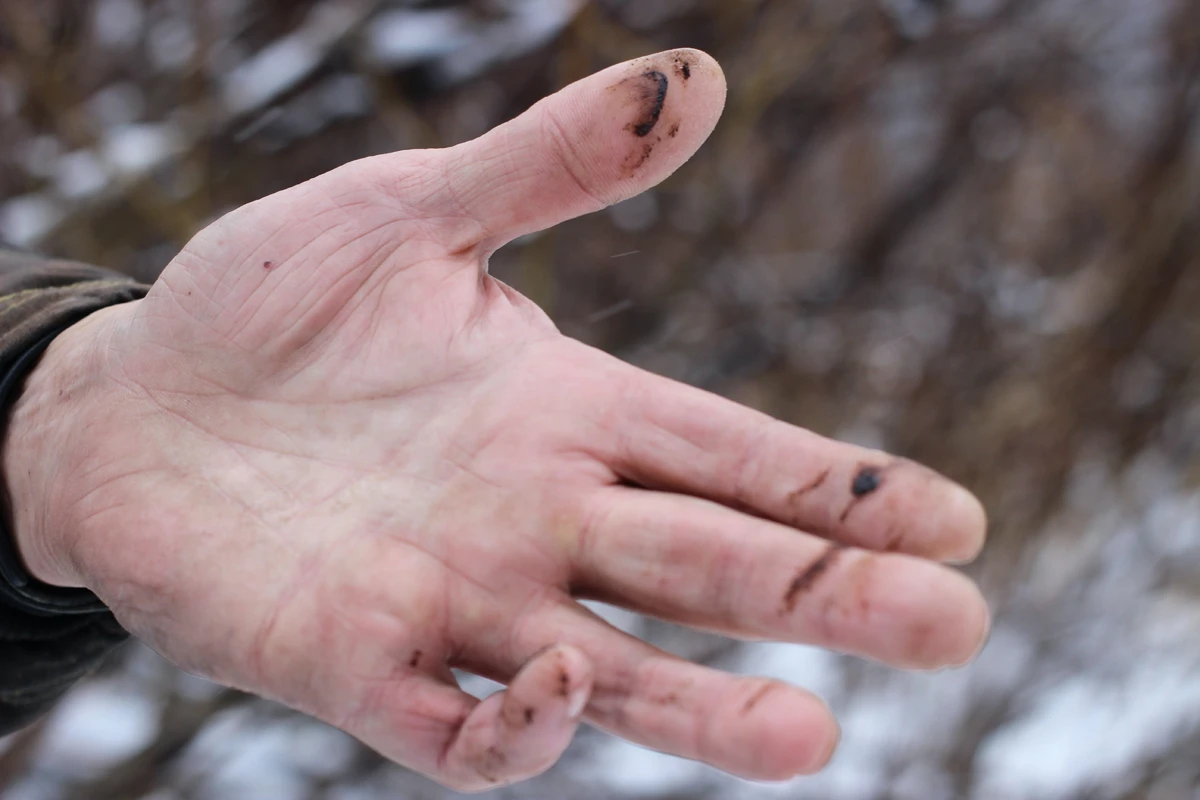 Спустя пять месяцев Игнатов показывает мне нефтяные залежи на Колве: темная полоса, оставшаяся на кустах после падения уровня воды, тянется десятки километров вдоль берега. Масляную грязь с резким запахом легко снять с любой ветки.