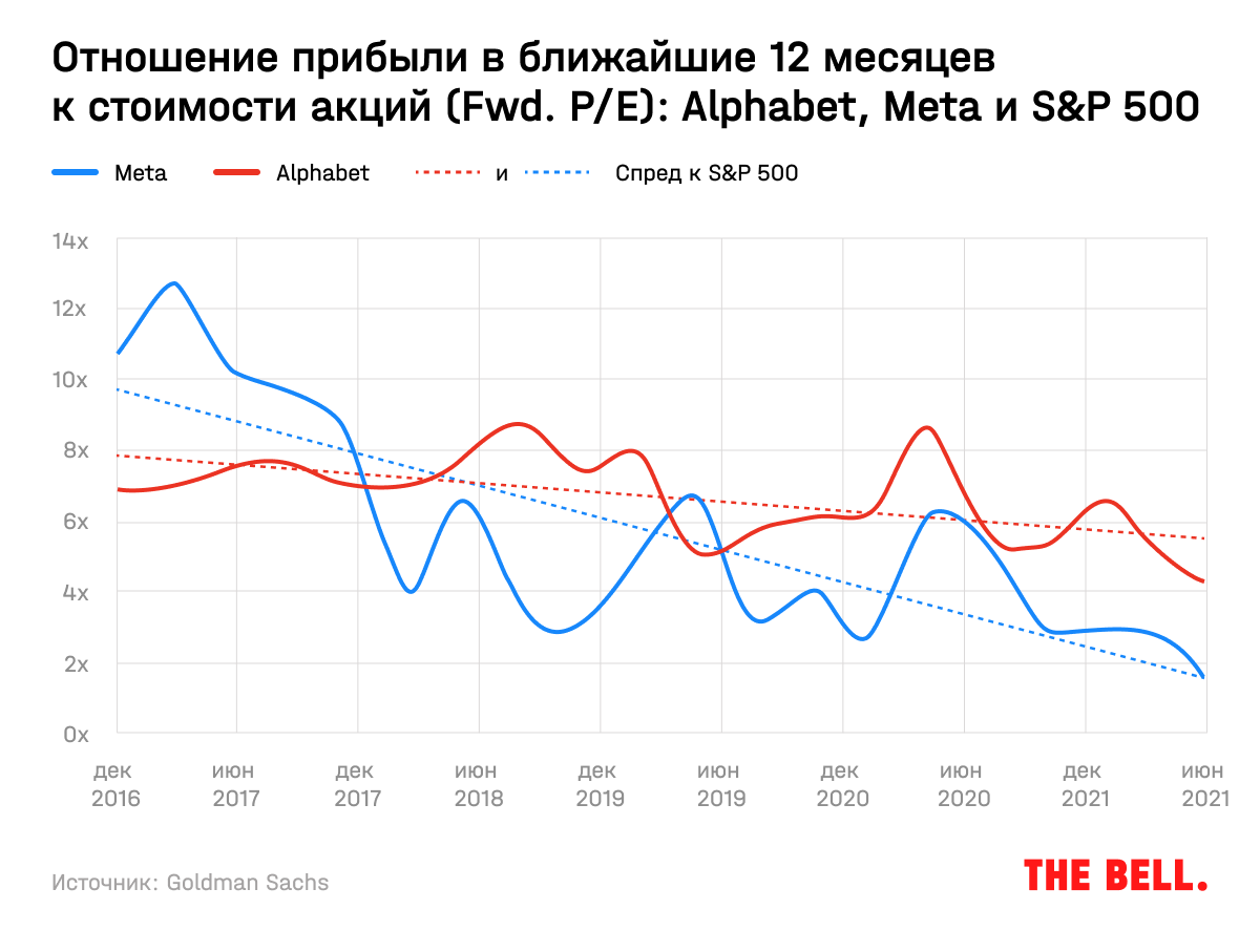 Все это уже не может не сказываться на цене техногигантов: сужение спреда между P/E Alphabet и Meta и среднерыночным в последние 5 лет — при том что их выручка росла быстрее рынка — аналитики Goldman Sachs связывают именно с повышенным вниманием регуляторов (отчет есть у The Bell).